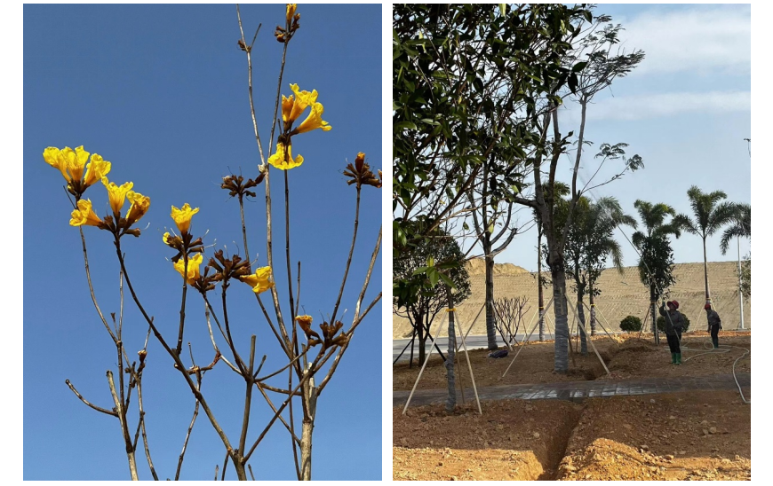 2023年3月12日,東粵環(huán)保的生產(chǎn)區(qū)域煥然一新。生產(chǎn)樓大門前的狐尾椰子樹,搖曳生姿,獨(dú)領(lǐng)風(fēng)騷;一旁的桂花樹,沉靜內(nèi)斂,毫不遜色;與其相陪襯的還有灰莉球、黃金葉球等,象征著樸素自然、清潔純凈。最引人矚目的莫過(guò)于黃花風(fēng)鈴木,黃色的花蕾映照綠樹婆娑的身影,更顯生機(jī)活力,象征感恩的寓意。