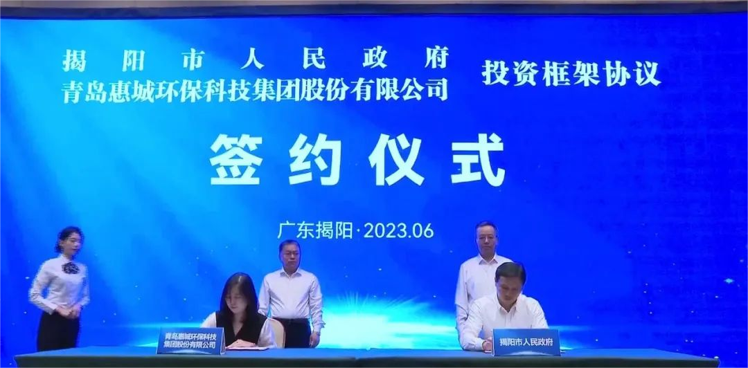6月18日,青島惠城環保科技集團股份有限公司與揭陽市人民政府在揭陽市區簽署投資框架協議,共同促進石化產業綠色低碳循環利用,助推揭陽經濟高質量發展。揭陽市市委副書記、市長支光南,惠城環保創始人、首席技術官張新功出席簽約儀式并上臺鑒簽。